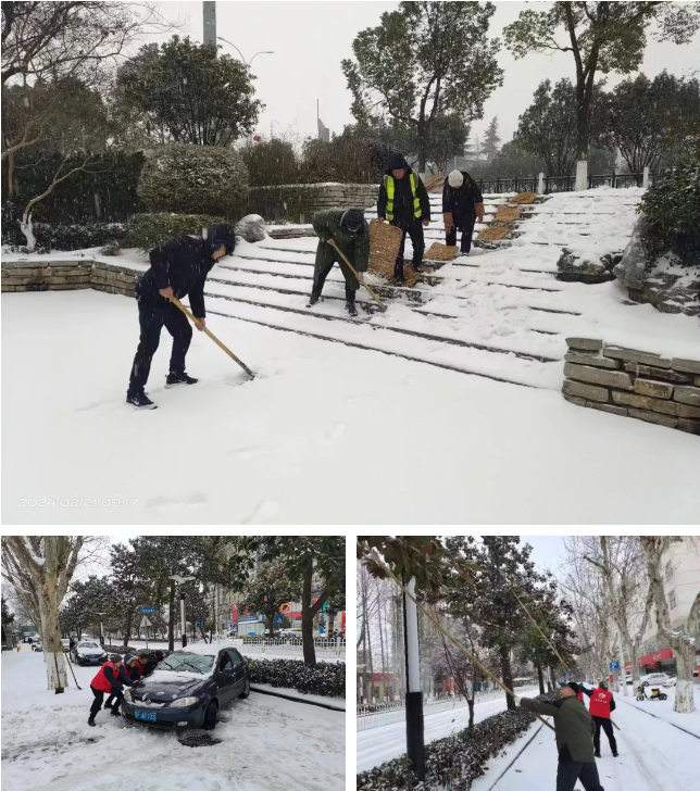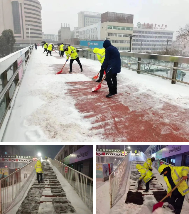 凍雨剛落,迅速安排人員融冰除雪,最大限度防止凍雨凝結(jié)成塊。2月20日晚上10點(diǎn)、12點(diǎn),21日凌晨5點(diǎn)分別出動(dòng)人員機(jī)械除冰除雪,其中市政管理處14支應(yīng)急隊(duì)伍共計(jì)272人趕至市區(qū)14座人行天橋,橋管中心6支應(yīng)急隊(duì)伍反復(fù)在大型橋梁上除冰除雪,建管中心全員出動(dòng)到襄江大道高架除冰除雪,各公園廣場(chǎng)、綠化養(yǎng)護(hù)單位提前做好植物防寒保暖工作,全員出動(dòng)鏟雪除冰,各安全監(jiān)管單位加強(qiáng)建筑工地施工安全巡查管控,全力筑牢住建領(lǐng)域安全防線。加強(qiáng)對(duì)各住宅小區(qū)物業(yè)指導(dǎo)和公租房小區(qū)設(shè)施設(shè)備排查,動(dòng)員352家物業(yè)服務(wù)企業(yè),發(fā)動(dòng)3000余名物業(yè)服務(wù)人員開展除冰掃雪,動(dòng)員所有在襄建筑業(yè)企業(yè)出動(dòng)933人、50臺(tái)鏟車、13臺(tái)裝載機(jī)、20臺(tái)渣土車對(duì)城區(qū)主要道路、橋梁及人行道進(jìn)行除雪作業(yè)。