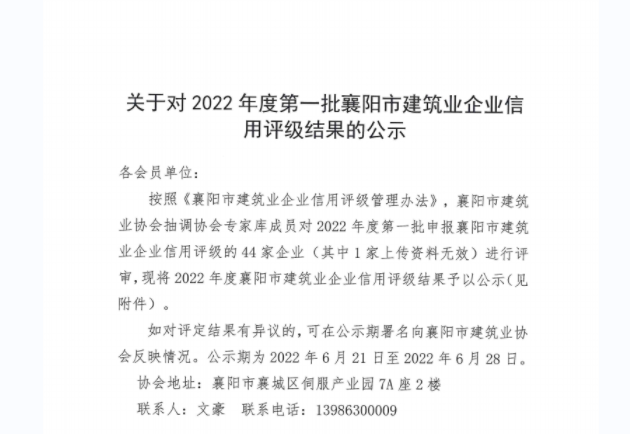 附件:關于對2022年度第一批襄陽市建筑業企業信用評級結果的公示.pdf 【查看全文】