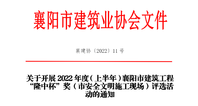 襄建協〔2022〕11號關于開展2022年度(上半年)襄陽市建筑工程“隆中杯”獎(市安全文明施工現場)評選活動的... 【查看全文】