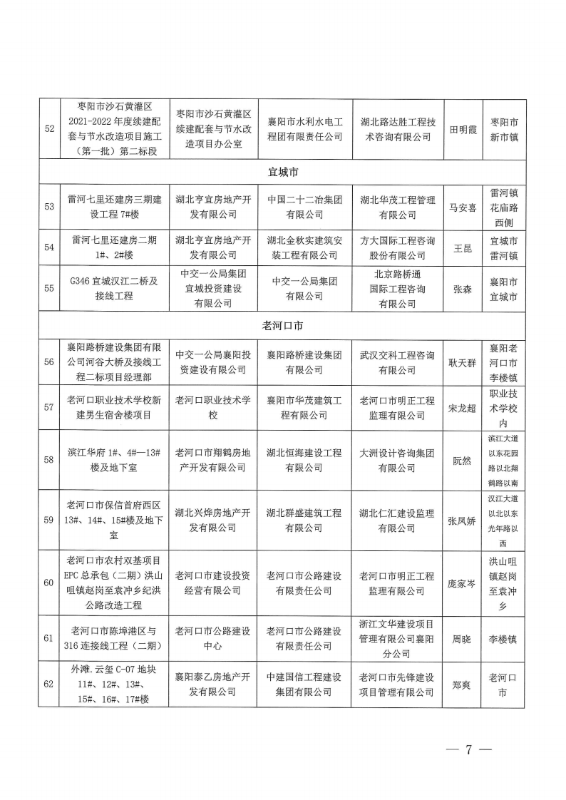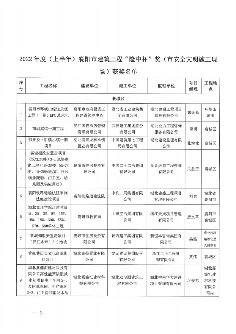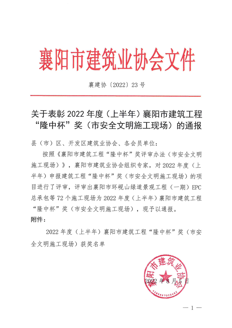 關(guān)于表彰2022年度(上半年)襄陽市建筑工程“隆中杯”獎(jiǎng)(市安全文明施工現(xiàn)場(chǎng))的通報(bào)