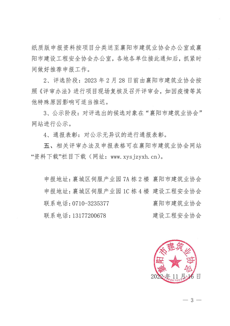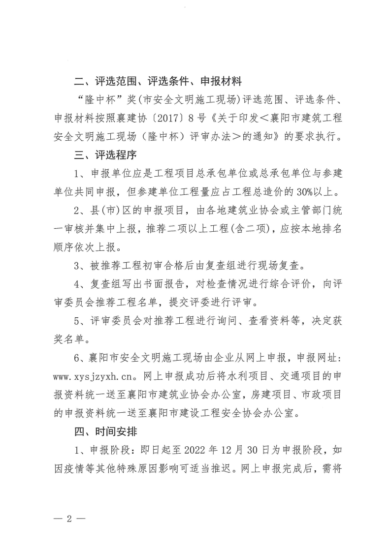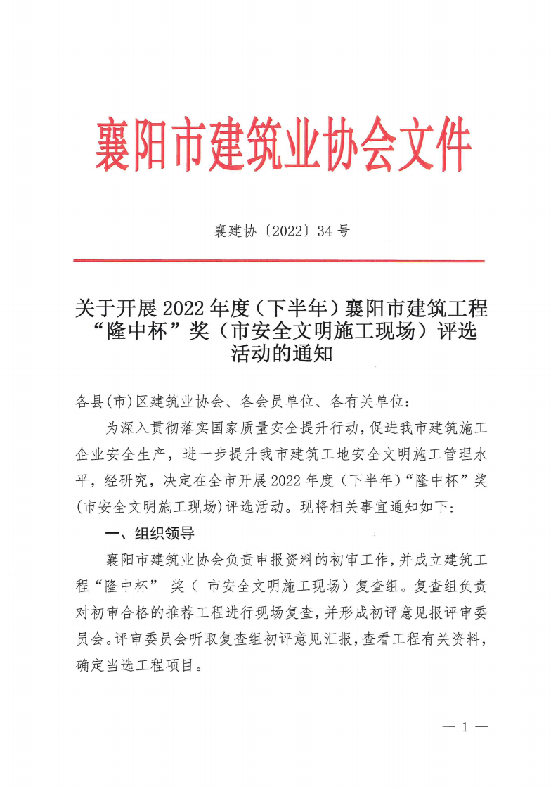 關(guān)于開展2022年度(下半年)襄陽市建筑工程“隆中杯”獎(jiǎng)(市安全文明施工現(xiàn)場)評(píng)選活動(dòng)的通知