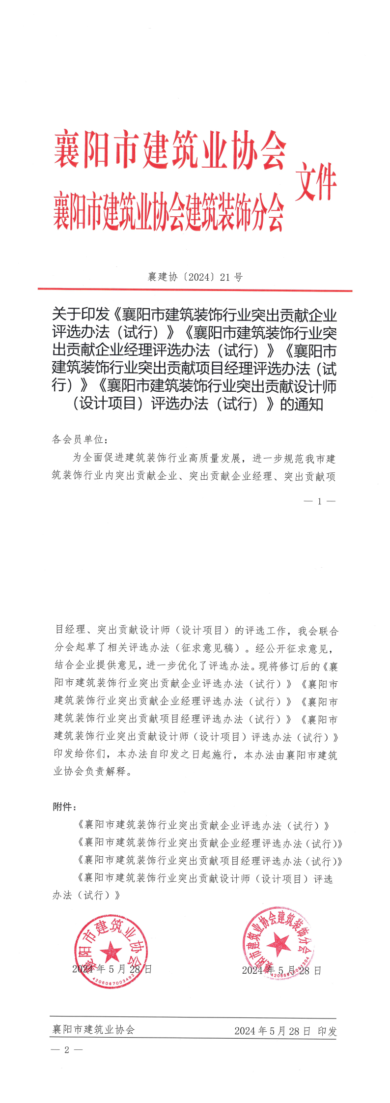 為全面促進建筑裝飾行業(yè)高質(zhì)量發(fā)展,進一步規(guī)范我市建筑裝飾行業(yè)內(nèi)突出貢獻企業(yè)、突出貢獻企業(yè)經(jīng)理、突出貢獻項目經(jīng)理、突出貢獻設(shè)計師(設(shè)計項目)的評選工作,我會聯(lián)合分會起草了相關(guān)評選辦法(征求意見稿)。經(jīng)公開征求意見,結(jié)合企業(yè)提供意見,進一步優(yōu)化了評選辦法。現(xiàn)將修訂后的《襄陽市建筑裝飾行業(yè)突出貢獻企業(yè)評選辦法(試行)》《襄陽市建筑裝飾行業(yè)突出貢獻企業(yè)經(jīng)理評選辦法(試行)》《襄陽市建筑裝飾行業(yè)突出貢獻項目經(jīng)理評選辦法(試行)》《襄陽市建筑裝飾行業(yè)突出貢獻設(shè)計師(設(shè)計項目)評選辦法(試行)》印發(fā)給你們,本辦法自印發(fā)之日起施行,本辦法由襄陽市建筑業(yè)協(xié)會負責(zé)解釋。
