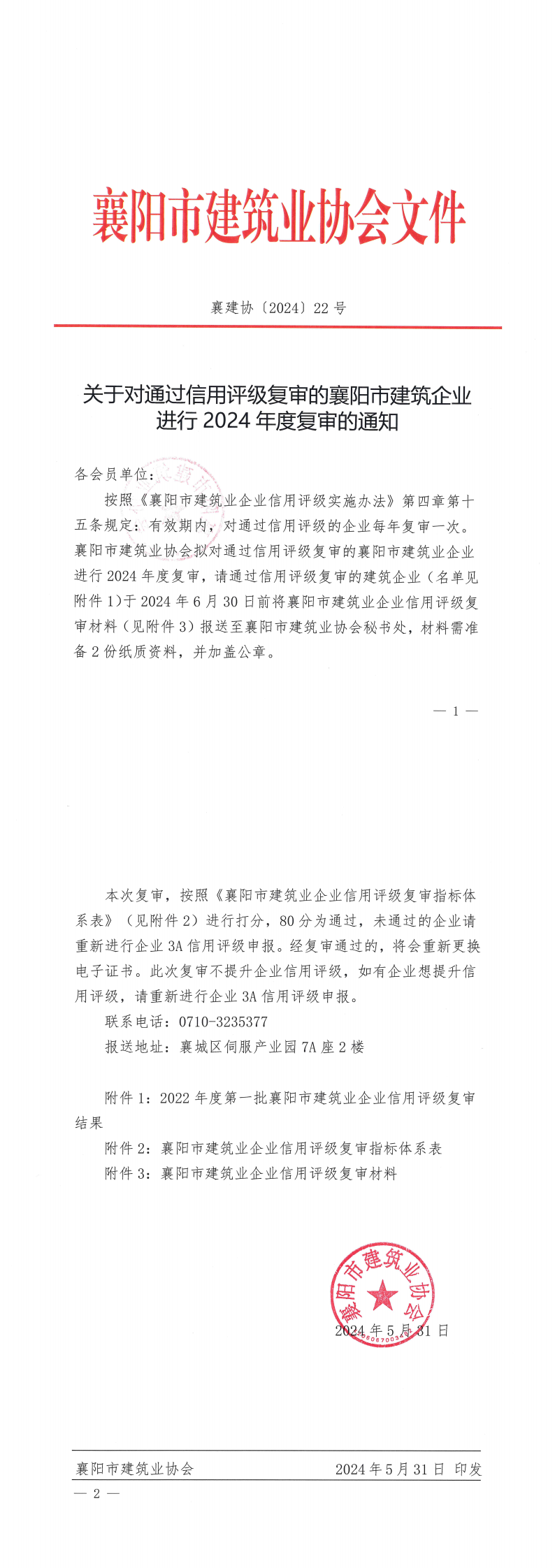 按照《襄陽市建筑業(yè)企業(yè)信用評級實施辦法》第四章第十五條規(guī)定:有效期內(nèi),對通過信用評級的企業(yè)每年復(fù)審一次。襄陽市建筑業(yè)協(xié)會擬對通過信用評級復(fù)審的襄陽市建筑業(yè)企業(yè)進(jìn)行2024年度復(fù)審,請通過信用評級復(fù)審的建筑企業(yè)(名單見附件1)于2024年6月30日前將襄陽市建筑業(yè)企業(yè)信用評級復(fù)審材料(見附件3)報送至襄陽市建筑業(yè)協(xié)會秘書處,材料需準(zhǔn)備2份紙質(zhì)資料,并加蓋公章。