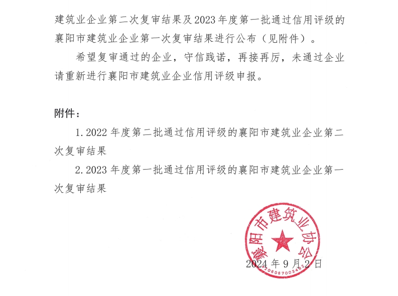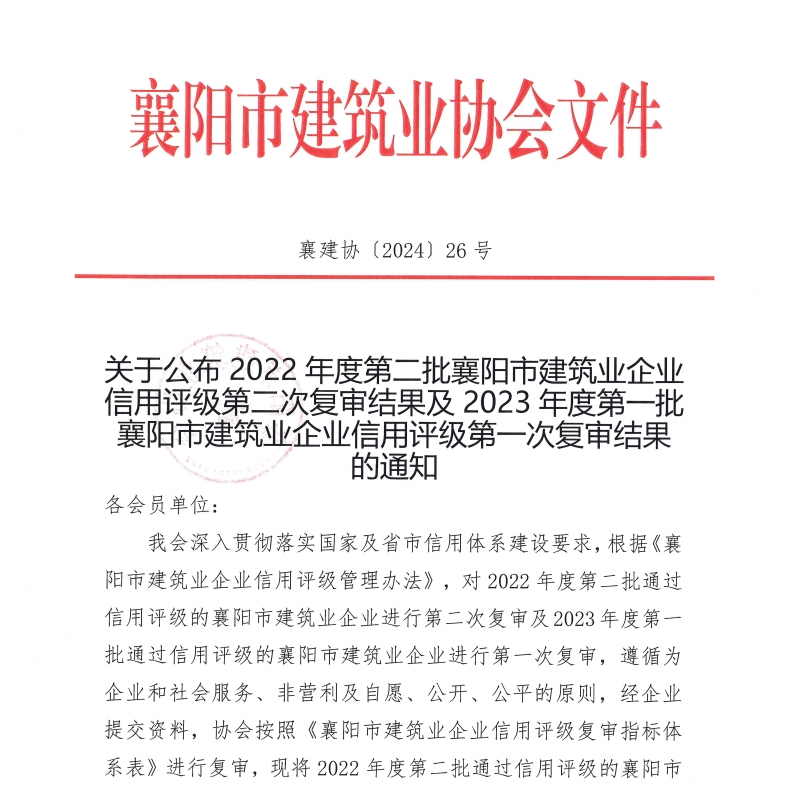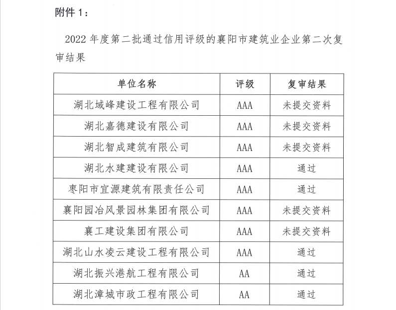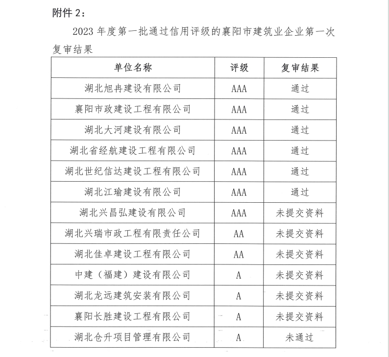 2022 年度第二批襄陽市建筑業企業信用評級第二次復審結果及 2023 年度第一批襄陽市建筑業企業信用評級第一次復審結果的通知