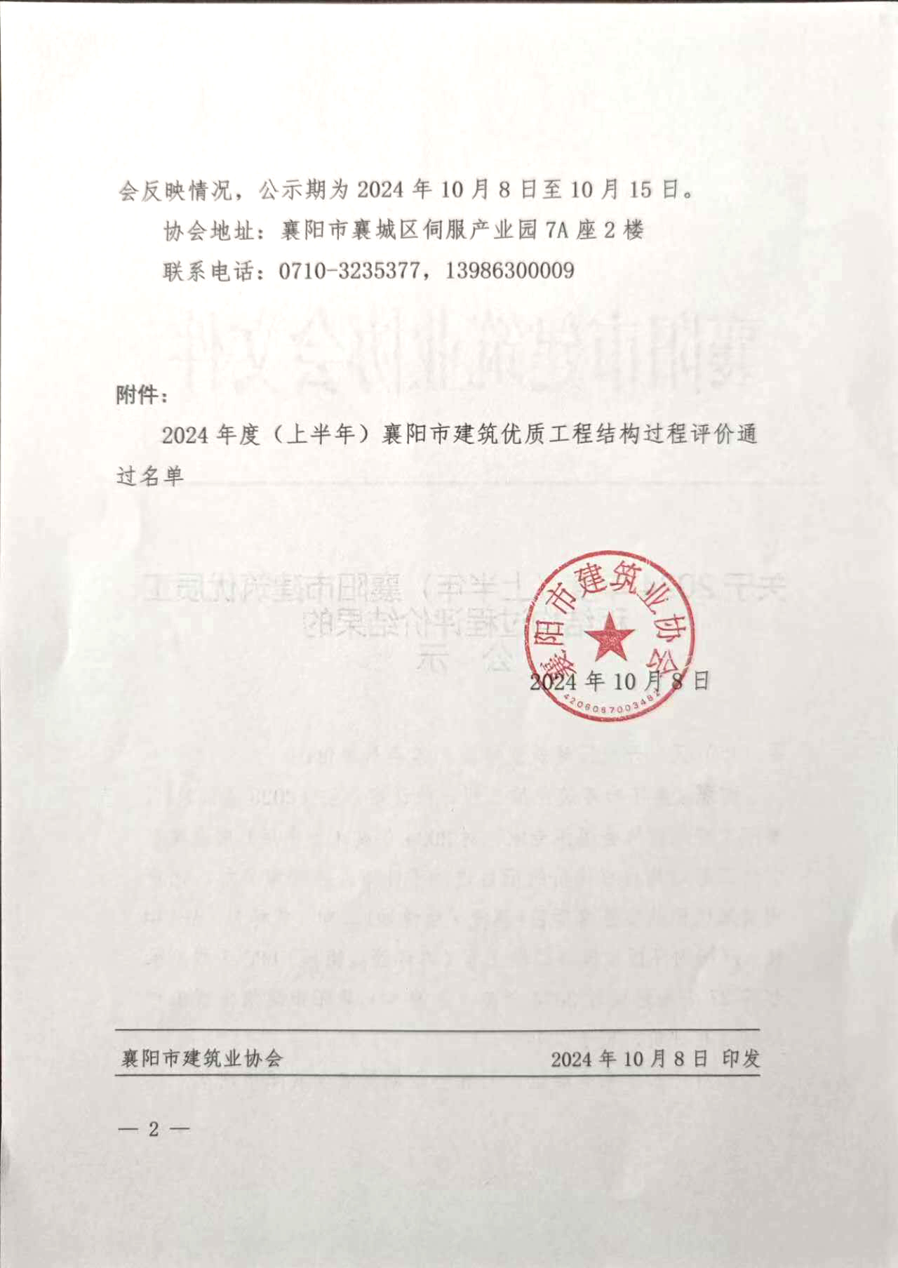 關于 2024年度(上半年)襄陽市建筑優質工程結構過程評價結果的公示