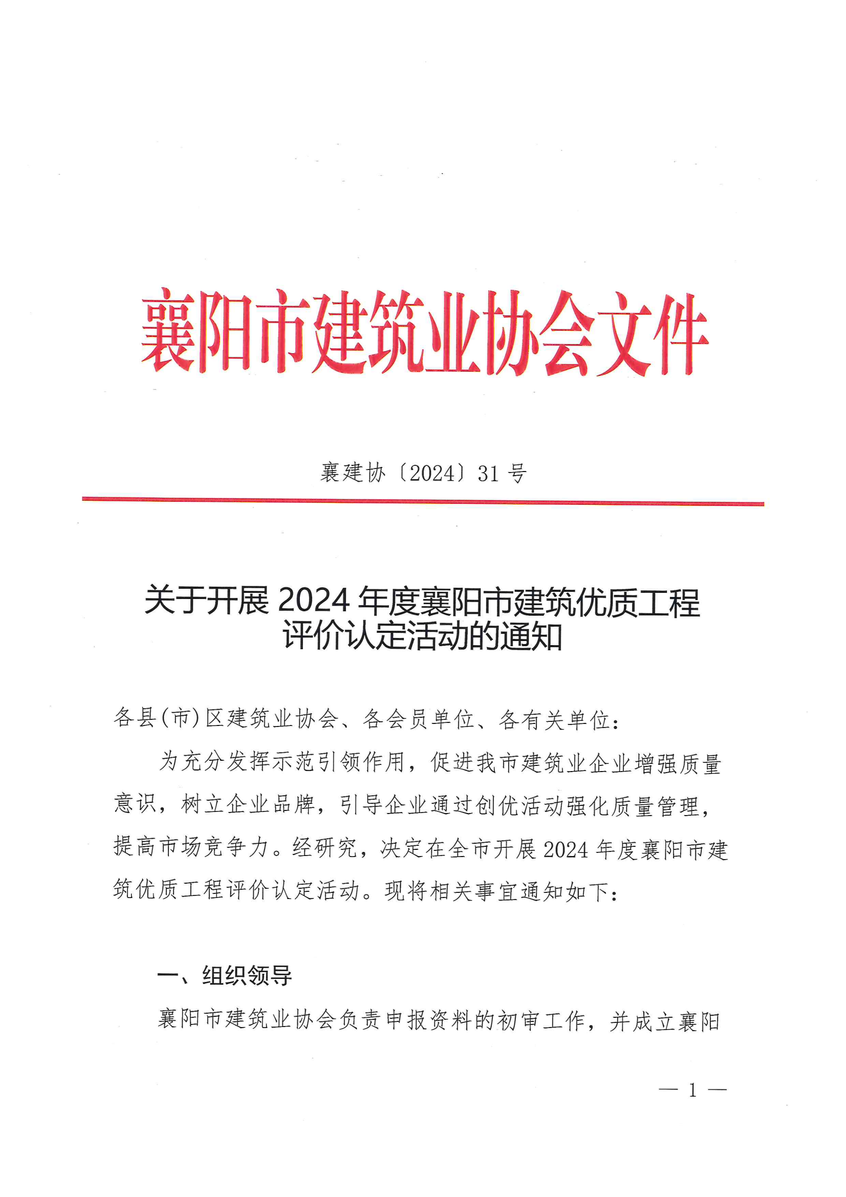 關(guān)于開展 2024 年度襄陽市建筑優(yōu)質(zhì)工程評價認(rèn)定活動的通知