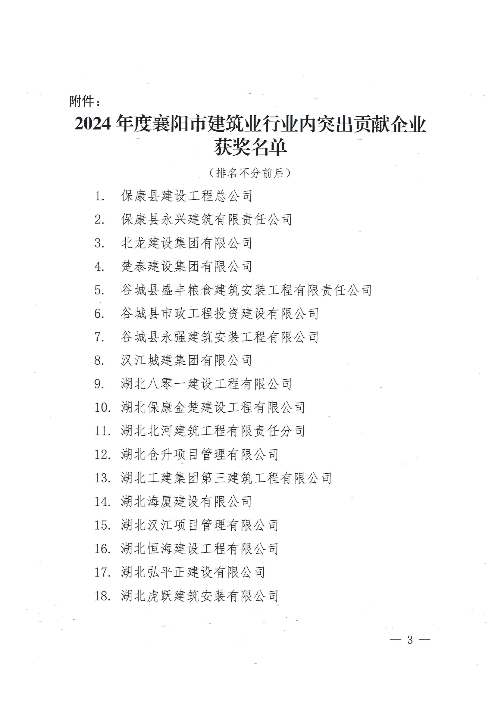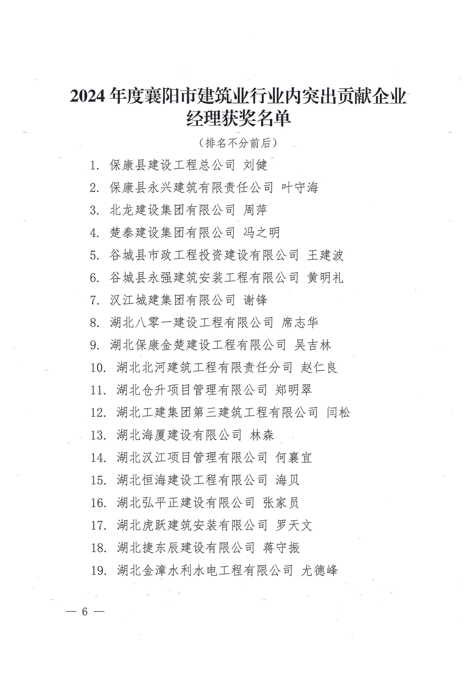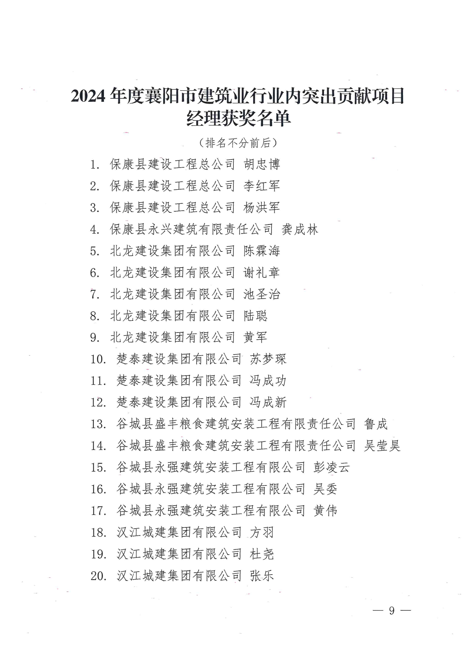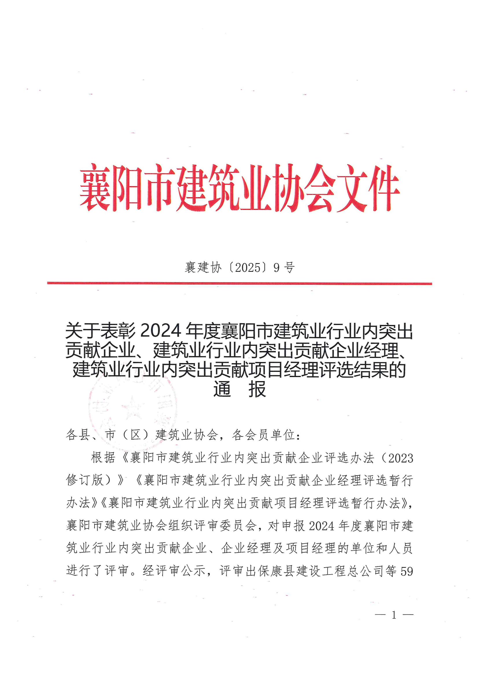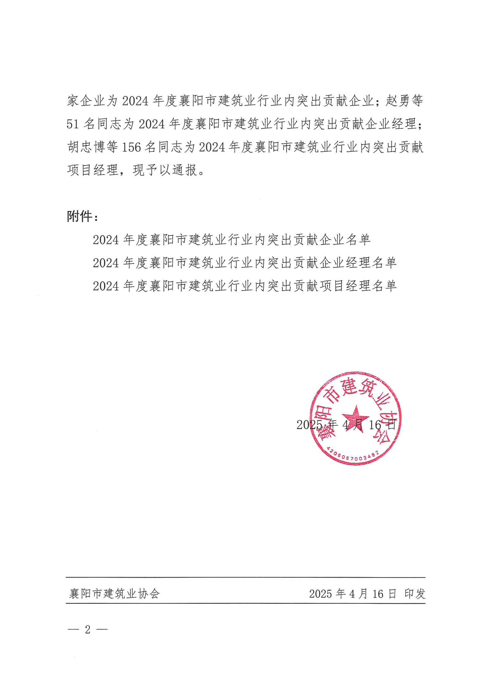 關于表彰2024年度襄陽市建筑業行業內突出貢獻企業、建筑業行業內突出貢獻企業經理、建筑業行業內突出貢獻項目經理評選結果的通報