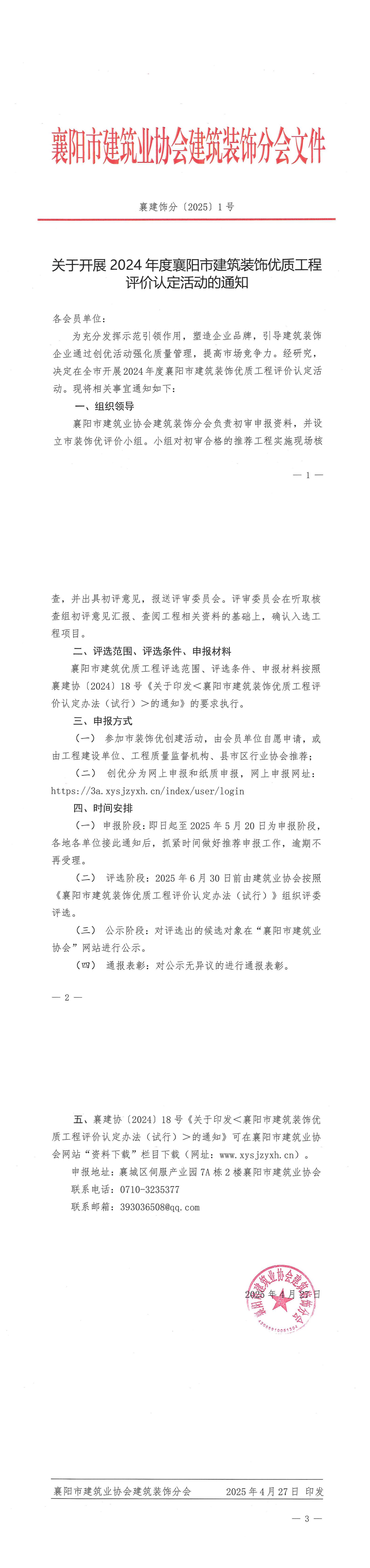 襄建飾分〔2025〕1號(hào) 關(guān)于開展2024年度襄陽市建筑裝飾優(yōu)質(zhì)工程評(píng)價(jià)認(rèn)定活動(dòng)的通知