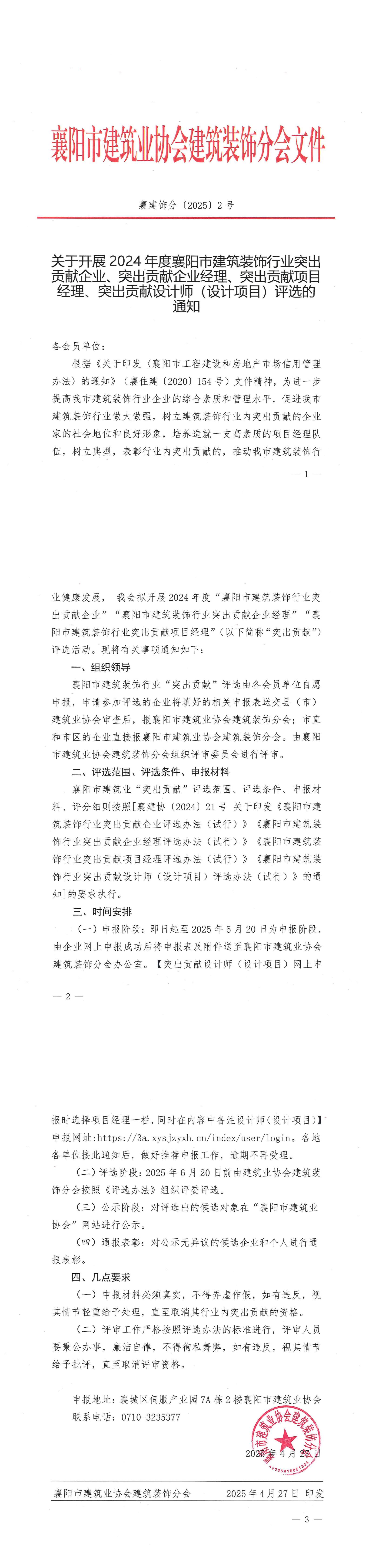 襄建飾分〔2025〕2號(hào) 關(guān)于開展2024年度襄陽(yáng)市建筑裝飾行業(yè)突出貢獻(xiàn)企業(yè)、突出貢獻(xiàn)企業(yè)經(jīng)理、突出貢獻(xiàn)項(xiàng)目經(jīng)理、突出貢獻(xiàn)設(shè)計(jì)師(設(shè)計(jì)項(xiàng)目)評(píng)選的通知