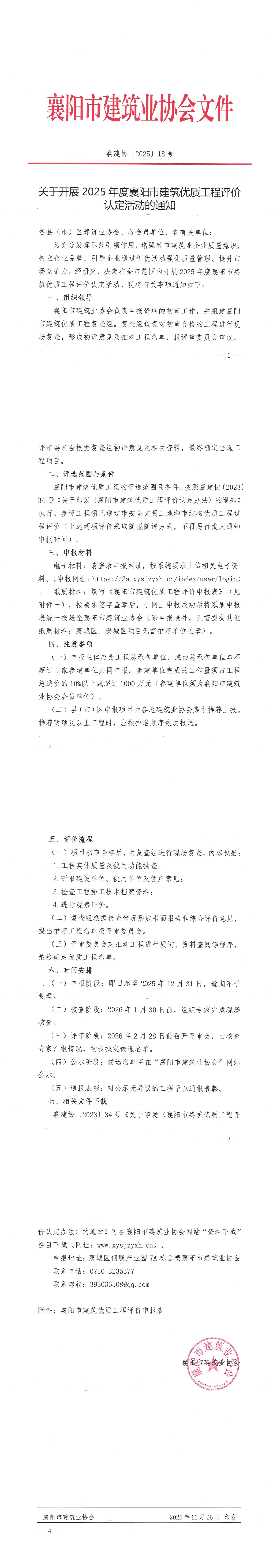 襄建協〔2025〕18號 關于開展2025年度襄陽市建筑優質工程評價認定活動的通知