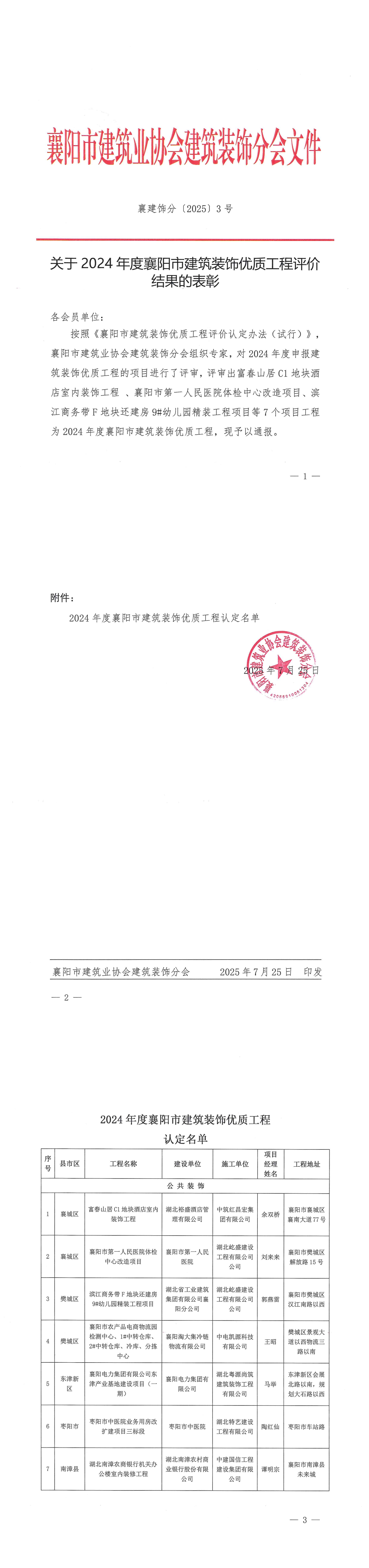 襄建飾分〔2025〕3號(hào) 關(guān)于表彰2025年度襄陽市建筑裝飾優(yōu)質(zhì)工程評(píng)價(jià)結(jié)果的通報(bào)