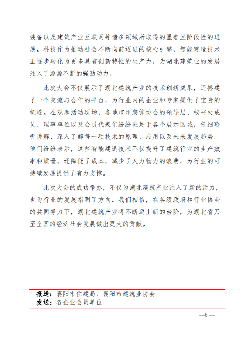 此次大會的成功舉辦,不僅為湖北建筑產(chǎn)業(yè)注入了新的活力,也為行業(yè)的發(fā)展指明了方向。我們相信,在各級政府和行業(yè)協(xié)會的共同努力下,湖北建筑產(chǎn)業(yè)將不斷邁上新的臺階,為湖北省乃至全國的經(jīng)濟社會發(fā)展做出更大的貢獻。